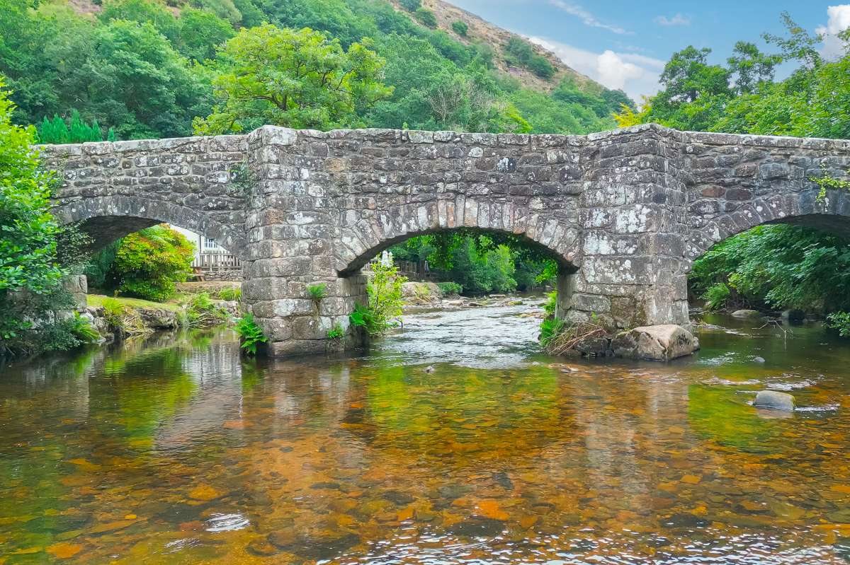 The Inn occupies a stunning position on the banks of the River Teign, immediately beside the 17th-century Grade II* listed Fingle Bridge. Set within a dramatic wooded gorge, the building is surrounded by ancient woodland protected by both the National Trust and Woodland Trust. It is an environment of rare natural beauty, where rushing water, wooded hillsides and a timeless stone bridge create one of Dartmoor's most photographed views. Despite its sense of seclusion, the Inn is conveniently located just ten minutes' drive from
